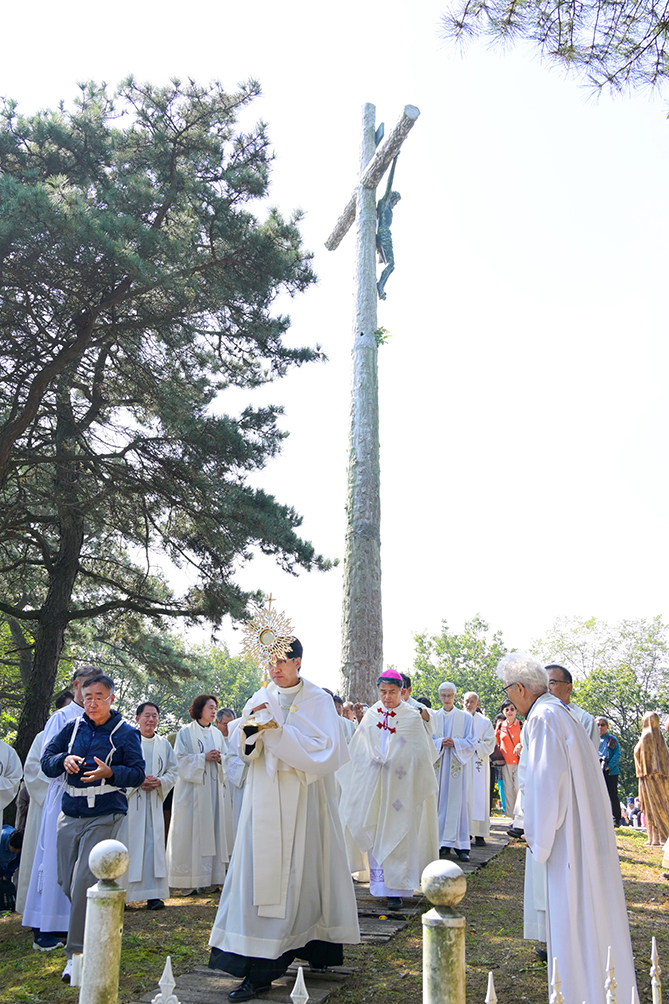 2일 청주교구 감곡매괴성모순례지성당에서 열린 제107차 감곡성체현양대회에서 교구장 김종강 주교가 성체를 들고 행렬하고 있다. 이날 성체현양대회는 경축미사 봉헌, 성체 행렬, 성체 강복, 감곡성당 유물 및 사진 전시, 교구 사제단 밴드 블랙셔츠 공연 등이 이어졌다. 장광동 명예기자