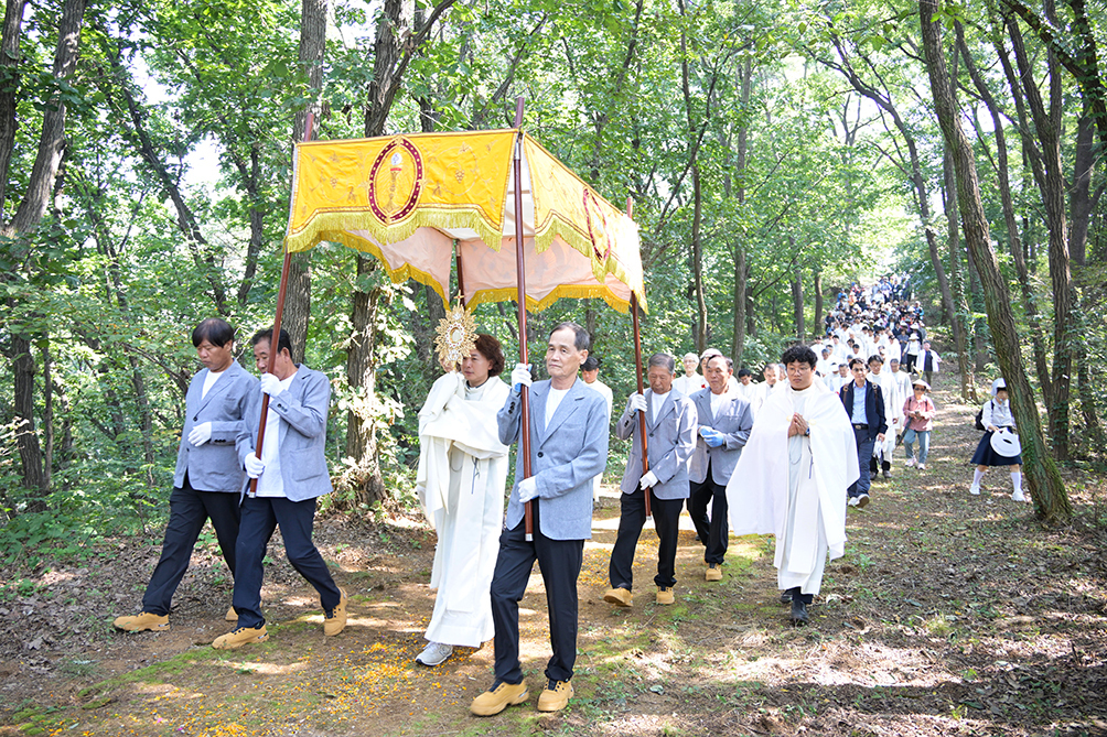 2일 청주교구 감곡매괴성모순례지성당에서 열린 제107차 감곡성체현양대회에 참가한 이들이 성체 행렬을 하고 있다. 이날 성체현양대회에서는 교구장 김종강 주교 주례로 경축미사가 봉헌됐으며 성체 행렬, 성체 강복, 감곡성당 유물 및 사진 전시, 교구 사제단 밴드 블랙셔츠 공연 등이 이어졌다. 장광동 명예기자