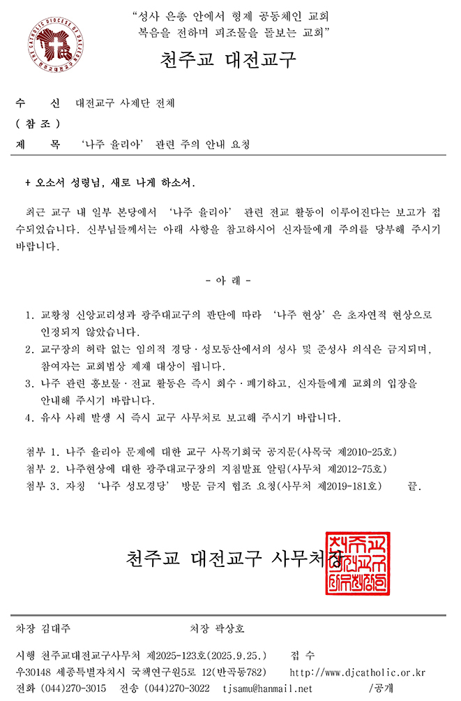 대전교구는 공문에 나주 윤 율리아 측이 주장하는 초자연적 현상이 교황청 승인을 받지 않았으며, 교구장 허락 없이 임의로 경당과 성모 동산에서 행하는 성사 및 준성사 의식은 금지되며 참여자는 교회법상 제재 대상이 된다고 명시했다.