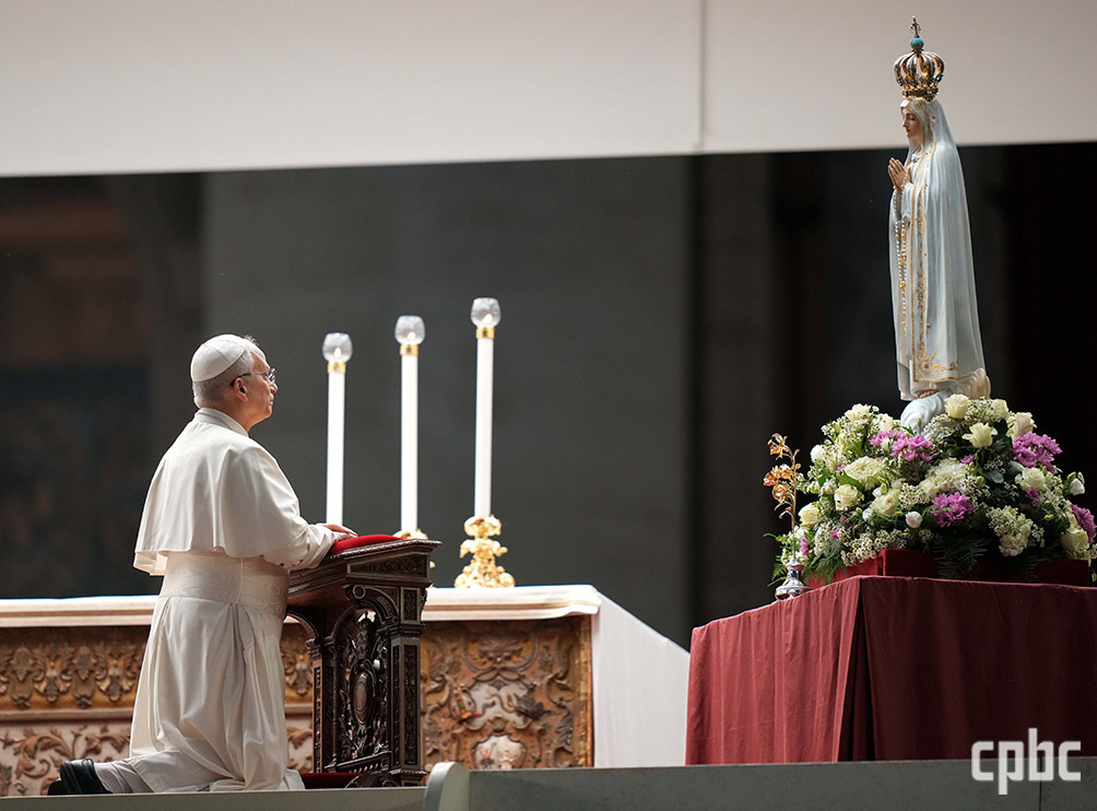 레오 14세 교황이 11일 바티칸 성 베드로 광장에서 파티마 성모상 앞에서 무릎을 꿇고 기도하고 있다. OSV