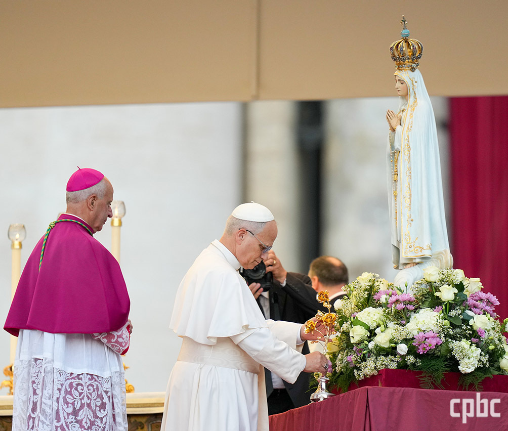 레오 14세 교황이 11일 바티칸 성 베드로 광장에 놓인 파티카 성모상 앞에 황금 장미를 봉헌하고 있다. OSV