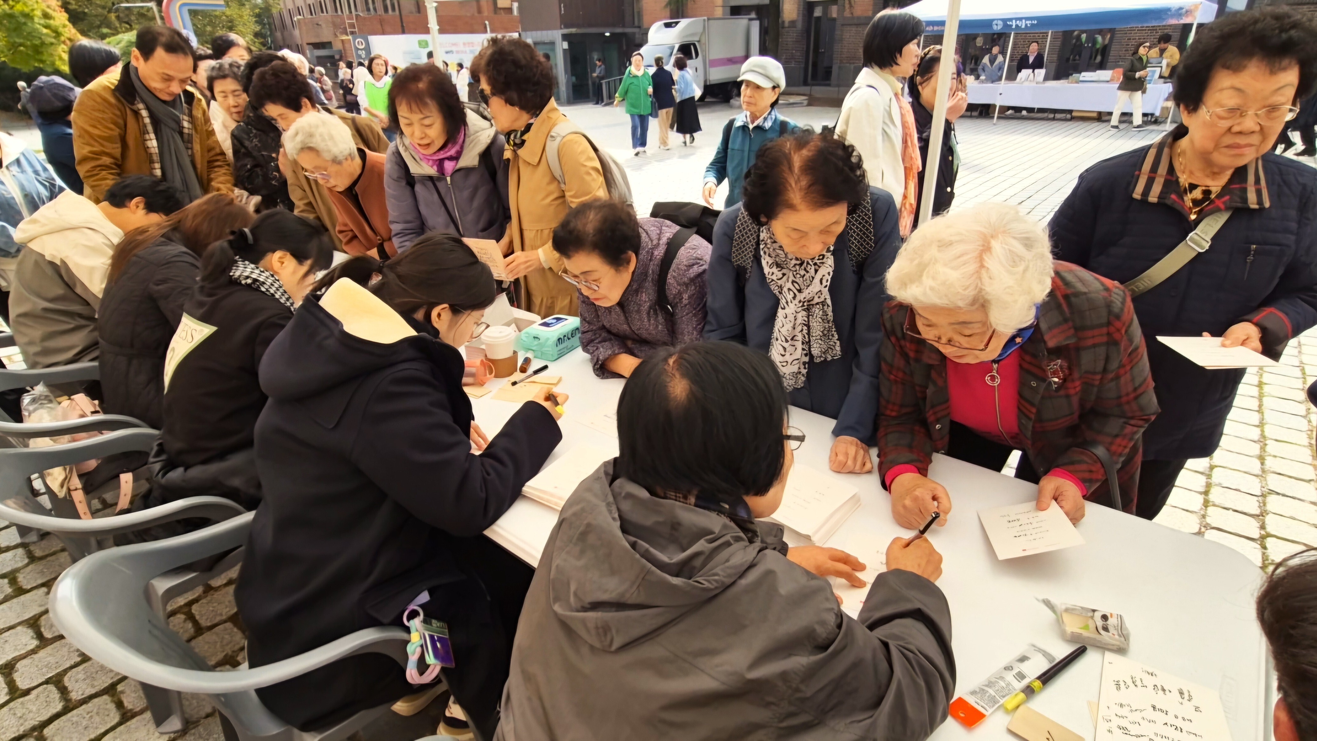 서울대교구 시니어의 희년 감사 미사를 마친 어르신들이 가톨릭말씀새김예술가회 부스에서 성경 말씀을 캘리그라피로 받아 가고 있다.