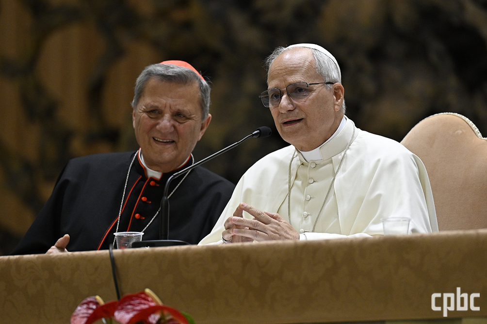 레오 14세 교황이 10월 24일 바티칸 바오로 6세 홀에서 열린 ‘시노드 팀과 참여 그룹들의 희년’ 개막 행사에서 연설하고 있다. OSV