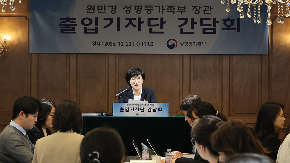 원민경 성평등가족부 장관이 23일오전 서울 종로구에서 열린 출입기자단 간담회에서 기자들의 질문에 답변하고 있다.