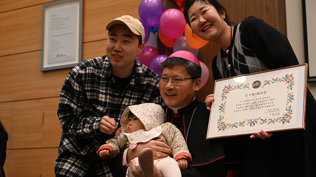 서울대교구장 정순택 대주교(가운데)가 나프로 임신법으로 아이를 출산한 부부와 기념 사진을 찍고 있다.