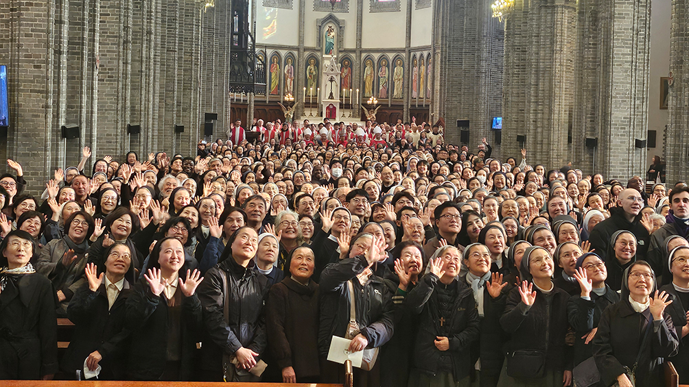 한국교회 축성생활의 해 폐막미사 후 미사에 참여한 이들이 손을 흔들고 환하게 웃으며 단체 기념 촬영을 하고 있다.