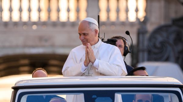 레오 14세 교황이 2025년 11월 5일 주간 일반 알현에 앞서 교황 전용차를 타고 바티칸 성 베드로 광장을 돌며 방문객과 순례자들에게 인사하고 있다. OSV