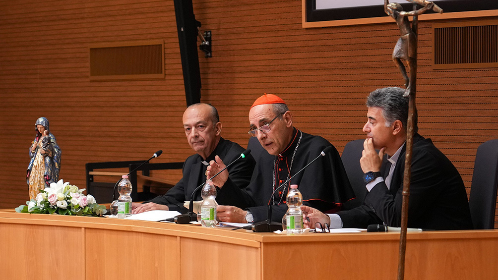 교황청 신앙교리부 장관 빅토르 마누엘 페르난데스 추기경이 4일 로마 예수회 본부에서 공지 「충실한 백성의 어머니」(Mater populi fidelis)를 발표하고 있다. 페르난데스 추기경의 옆에는 파나마의 수호성인인 '안티구아의 성모 마리아' 상이 세워져 있다. OSV