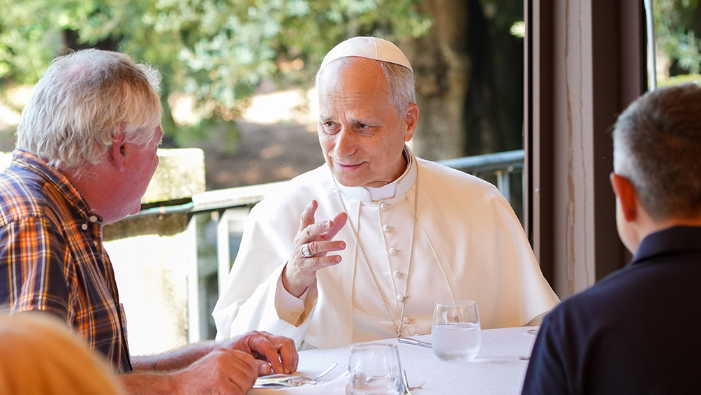 레오 14세 교황이 8월 17일 이탈리아 카스텔 간돌포 내 ‘찬미받으소서 학교’에서 열린 가난한 이들과의 식사 자리에서 한 신자와 대화를 나누고 있다. OSV