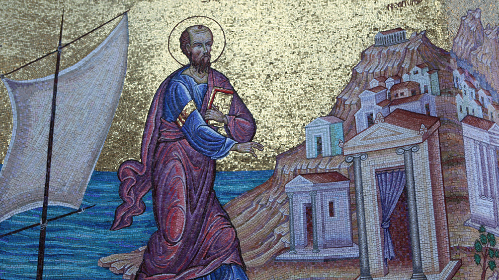 그리스 카발라 성 니콜라우스 성당(사도 바오로 도착 기념성당) 모자이크. 바오로 사도가 유럽 대륙에 첫발을 내딛는 장면을 묘사하고 있다.