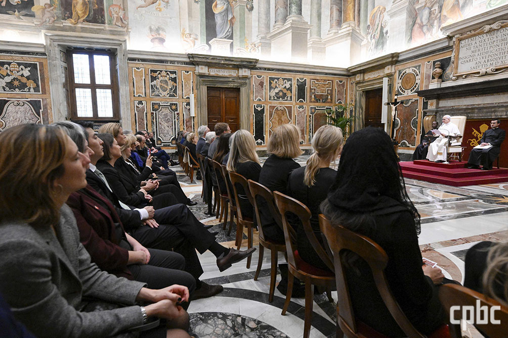 레오 14세 교황이 13일 바티칸에서 '인공지능 시대의 어린이와 청소년의 존엄성' 콘퍼런스 관계자들을 대상으로 연설하고 있다. OSV
