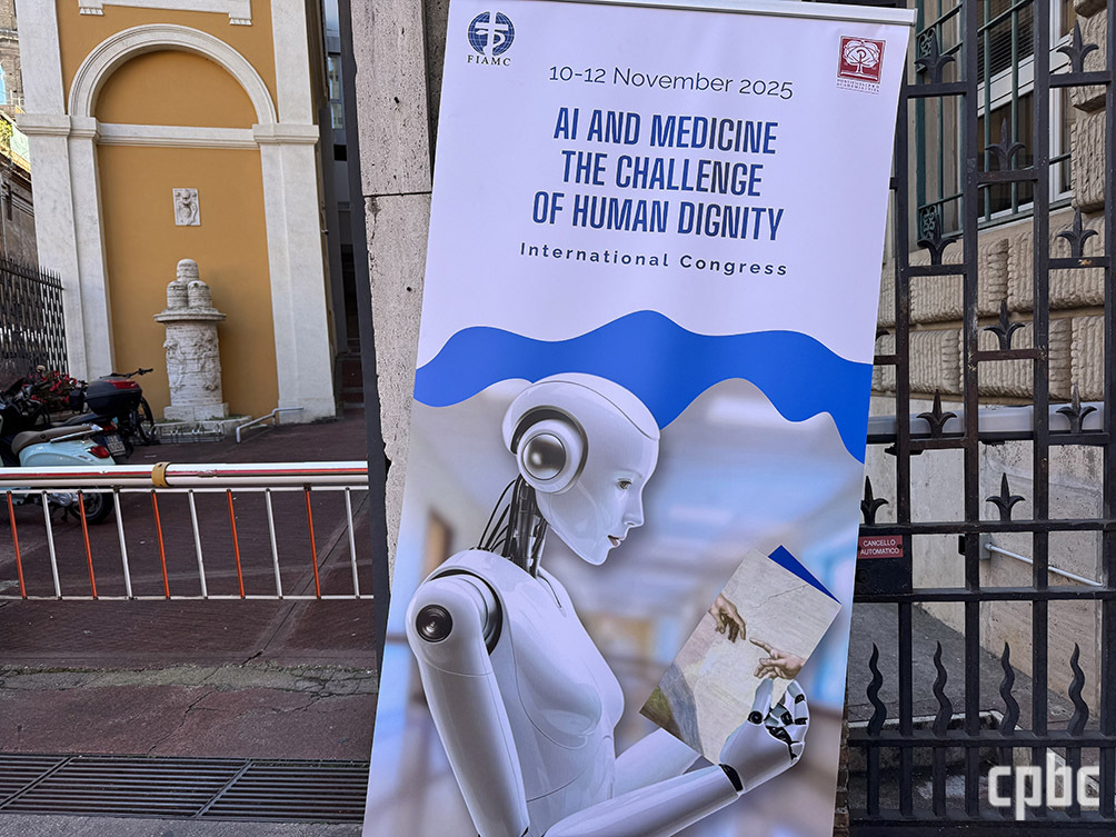 교황청립 생명학술원과 국제가톨릭의학협회에서 ‘인공지능과 의학 : 인간 존엄성의 도전’ 주제로 공동 개최한 국제 학술대회의 포스터가 학술대회가 열리고 있는 로마 예수회 본부 건물 외부에 게시되어 있다. OSV