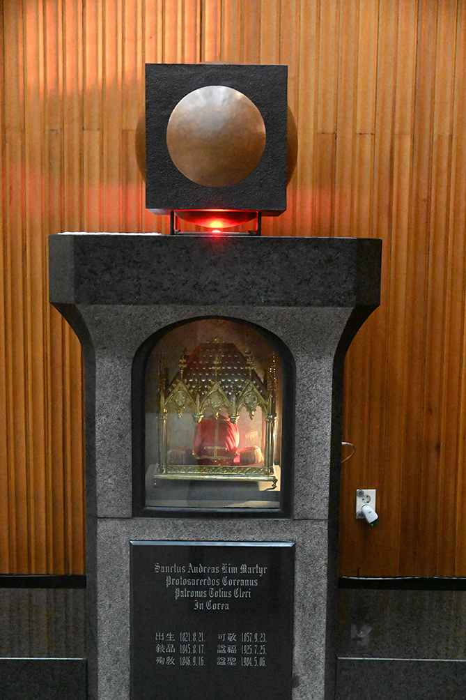 1960년 서울대교구 대신학교 대성당 제대에 안치된 한국인 첫 사제 김대건 안드레아 신부의 성해(두개골).