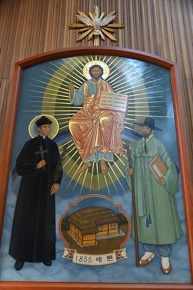 2015년 개교 160주년을 기념해 서울대교구 대신학교 대성당에 설치된 성화. 이콘연구소 소장 장긍선 신부와 회원들이 제작·기증했다. 그림 속 좌우 인물은 각각 한국인 첫번째와 두번째 사제인 성 김대건 안드레아 신부와 가경자 최양업 토마스 신부. 가운데 초가집은 한국 교회 첫 신학교인 배론 성요셉신학교다.