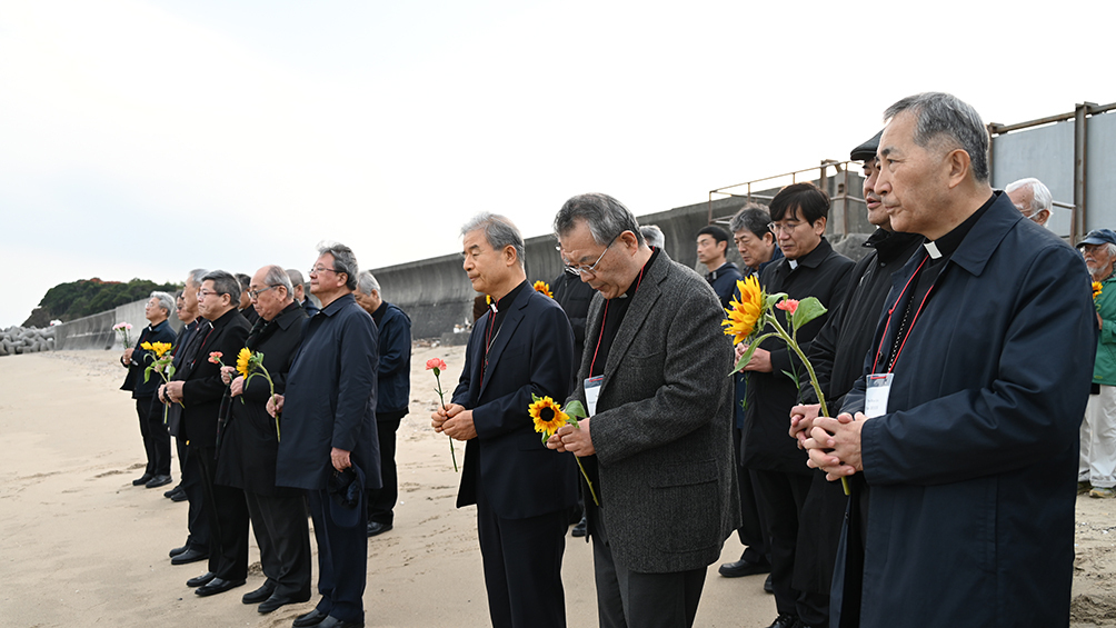 17일 일본 야마구치현 우베시의 마루나미 해안. 한국과 일본 주교들이 잔잔한 파도를 바라본다. 오래전 탄광의 환풍구 역할을 했던 콘크리트 기둥, ‘피야’(備矢) 두 개가 해면 위로 모습을 드러내고 있다. 주교들이 바친 해바라기꽃이 물결을 따라 떠다닌다.