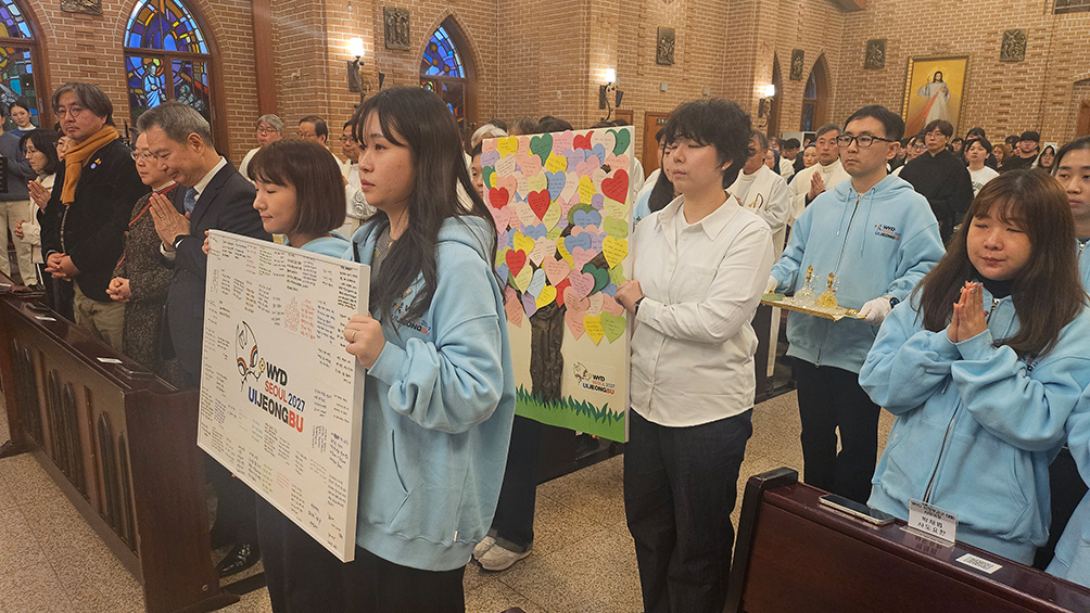 의정부교구 청년들이 2027 서울 세계청년대회와 의정부교구대회의 성공적 개최를 염원하는 기도를 봉헌하고 있다.
