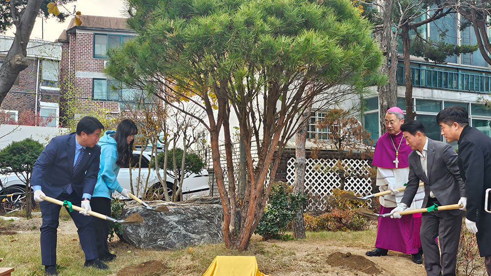2027 WYD 의정부교구대회 발대식 후 내외빈들이 대회 기념 나무에 흙을 덮고 있다.