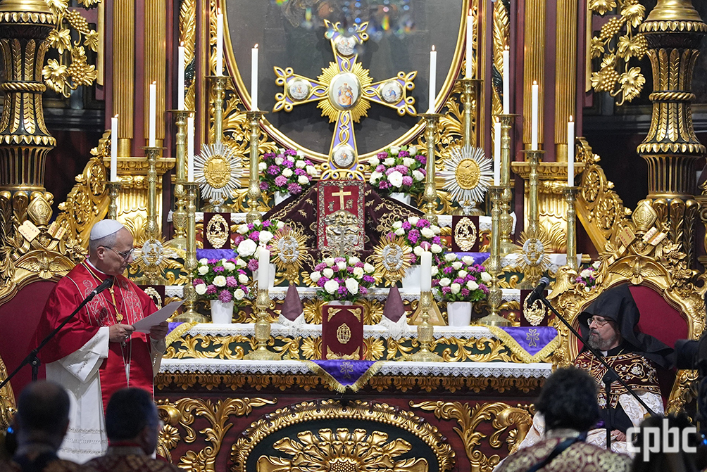 레오 14세 교황이 튀르키예 이스탄불의 아르메니아 사도 교회 총대주교좌성당에서 사하크 2세 콘스탄티노폴리스 총대주교에게 인사를 전하고 있다. OSV