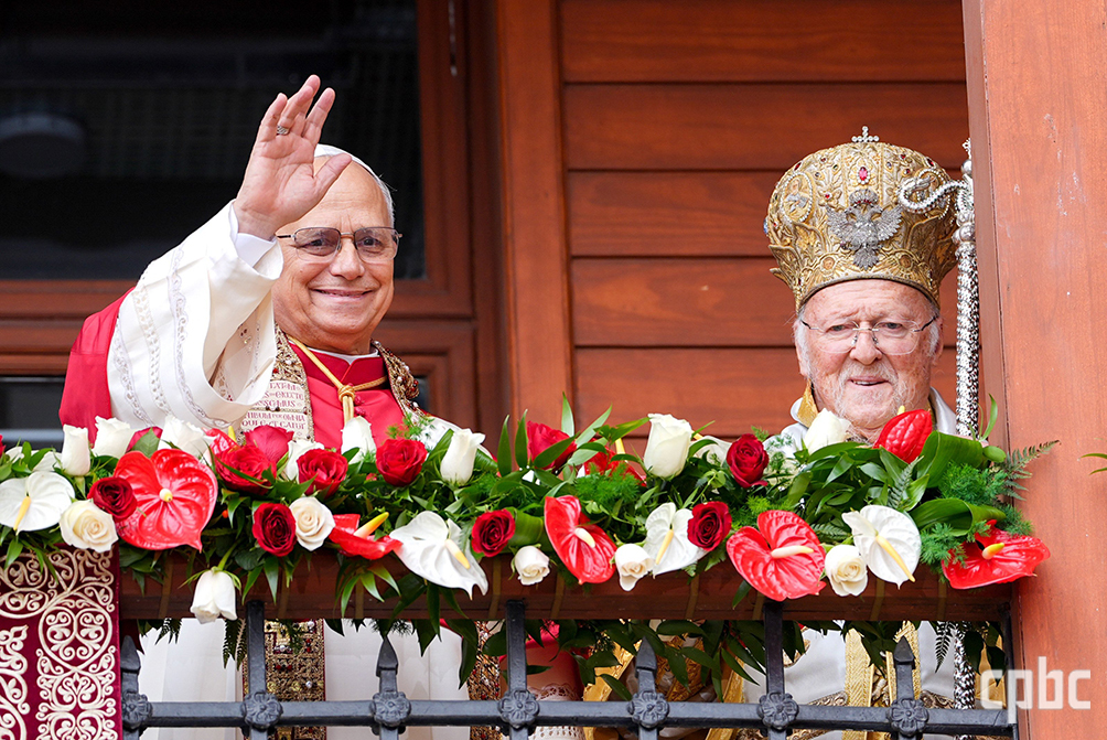 레오 14세 교황과 바르톨로메오 1세 정교회 콘스탄티노폴리스 세계총대주교가 이스탄불 성 제오르지오 총대주교좌성당에서 거행된 정교회 성찬 예배에 참여한 뒤, 발코니에서 인사하고 있다.