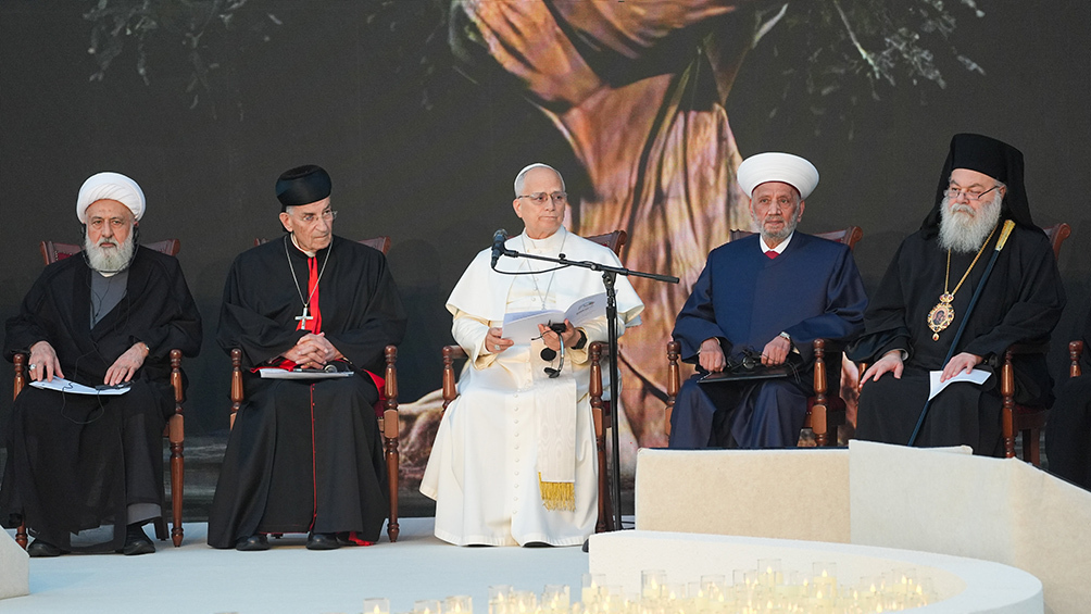 레오 14세 교황이 1일 레바논 베이루트에서 현지 그리스도인·무슬림 지도자들 함께 앉아 대화를 나누고 있다. OSV