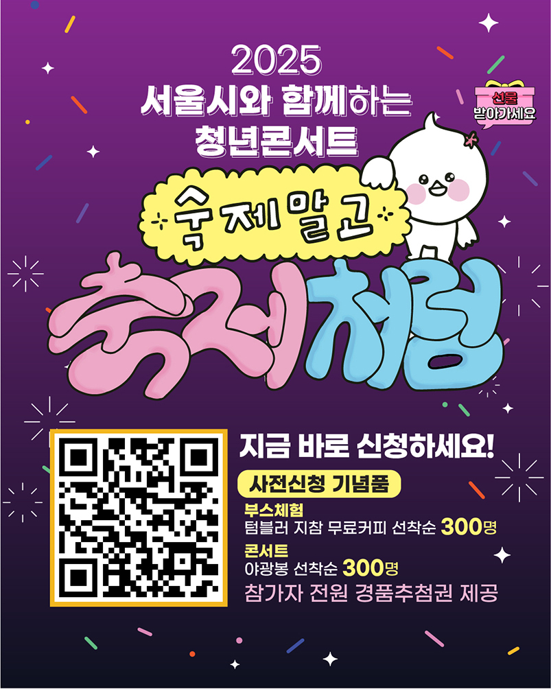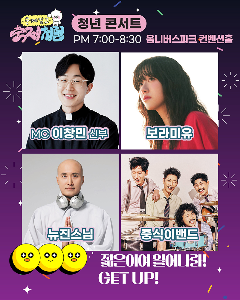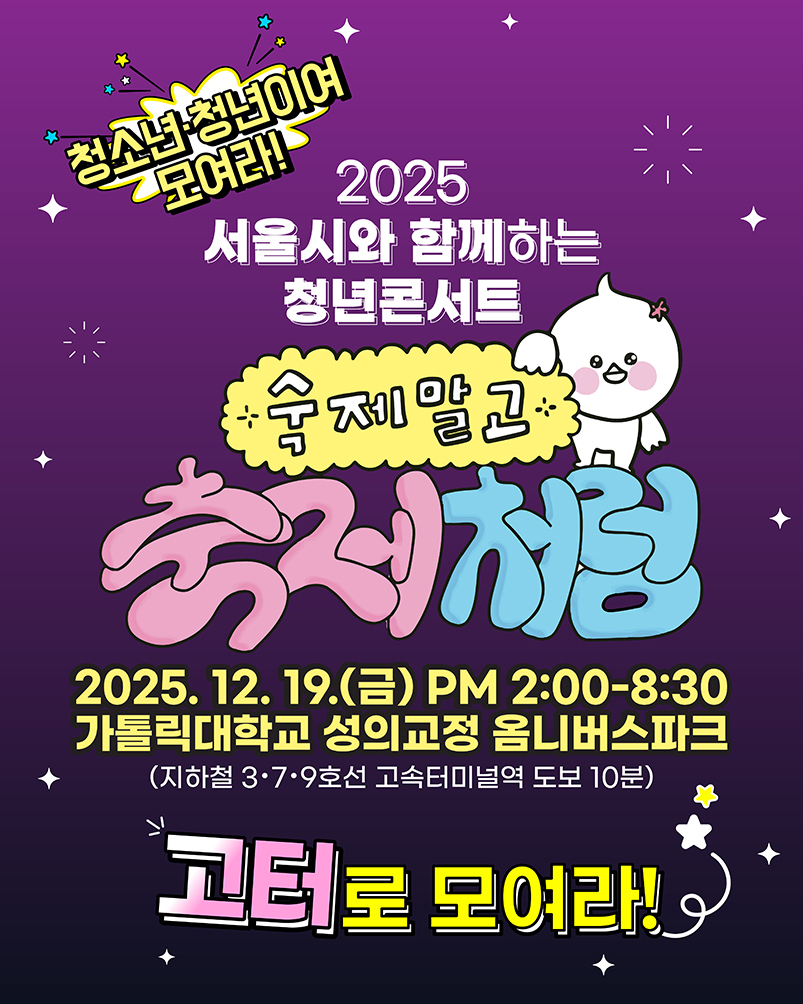 이 시대 모든 청소년·청년이 숙제처럼 느끼는 갖가지 고민을 나누고 다독이는 축제 현장 cpbc 가톨릭평화방송의 2025 서울시와 함께하는 청년 콘서트 ‘숙제말고 축제처럼’이 19일 금요일 오후 2시 서울 서초구 반포동 가톨릭대학교 성의교정 옴니버스파크에서 열린다.