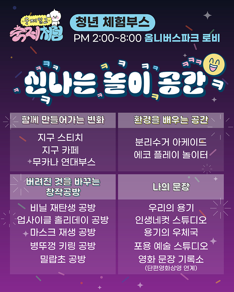숙제 같은 인생에 지친 젊은이들을 응원하고, 자유롭게 하나 된 장을 마련하고자 cpbc가 매년 서울시와 함께 개최해오고 있는 ‘숙제말고 축제처럼’은 올해 △청년 체험부스 △청년 단편영화 상영 △청년 콘서트 등으로 알차게 꾸며진다. 옴니버스파크 로비에서 열리는 ‘청년 체험부스’에서는 에코 플레이 놀이터 등 환경을 배우는 공간부터 밀랍초·병뚜껑 키링 등을 제작해보는 공방과 인생네컷 스튜디오, 용기를 적는 부스 등이 마련된다.