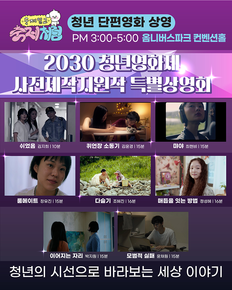 오후 3시부터 옴니버스파크 컨벤션홀에서는 2030 청년영화제 사전제작지원작 특별상영회로 청년 감독들이 젊은 시선으로 바라보고 제작한 단편 영화 8편이 2시간 동안 상영된다. 오후 7시부터 신나는 음악과 이야기가 있는 청년 콘서트 시간에는 뉴진스님, 가수 보라미유, 중식이밴드 등의 공연이 펼쳐진다. 진행은 젊은이들과 톡톡 튀는 소통을 이어오고 있는 끼 많은 수도 사제 이창민(살레시오회) 신부가 맡는다.