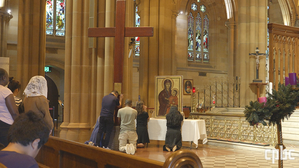 시드니대교구 세인트 메리 대성당에서 12월 4일 신자들이 WYD 십자가와 성모 성화 앞에 무릎을 꿇고 기도하고 있다.