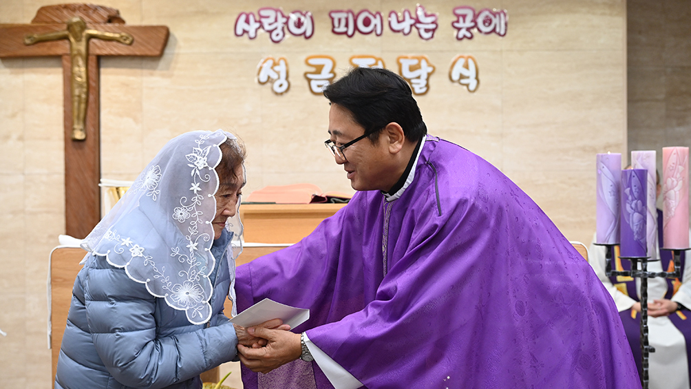 cpbc 사장 조정래 신부가 12일 서울 cpbc 본사 성당에서 열린 제140차 사랑이 피어나는 곳에 성금전달식에서 1831호(10월 26자) 신문을 통해 어려운 사연이 전해진 서정숙씨에게 성금을 전달하고 있다.
