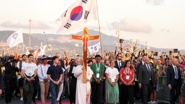 레오 14세 교황이 2025년 8월 2일 로마 토르 베르가타에서 젊은이들과 함께 철야 기도를 올린 뒤 희년 십자가를 들고 행진하고 있다. 한국 청년 대표단의 대형 태극기가 휘날리고 있다. OSV