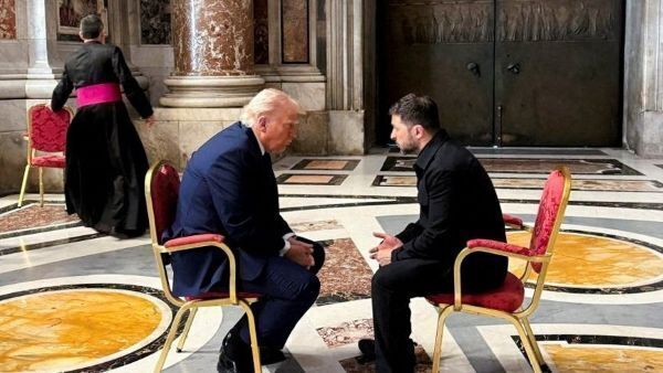 도널드 트럼프 미국 대통령과 볼로디미르 젤렌스키 우크라이나 대통령이 2025년 4월 26일 프란치스코 교황의 장례 미사 참석 후 바티칸 성 베드로 대성전에서 회동하고 있다. OSV
