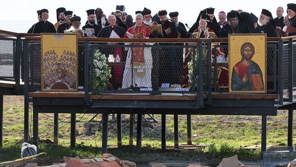 레오 14세 교황(가운데)이 1,700년 전 첫 보편 공의회가 열린 니케아(현 튀르키예 이즈니크) 성 네오피토 대성전 유적지에서 정교회 바르톨로메오 1세 세계총대주교(오른쪽)를 비롯한 여러 교회 지도자들과 함께 교회 일치 기도를 바치고 있다. OSV