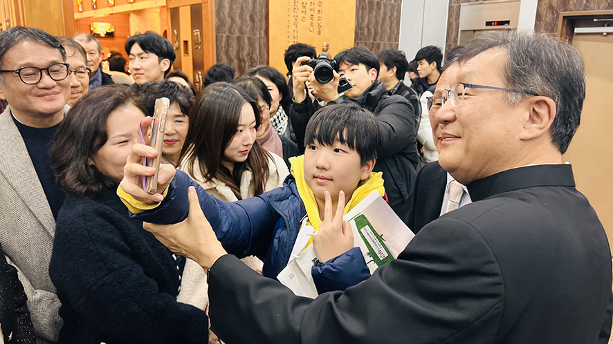 수원교구 신임 보좌주교의 임명 소식이 20일 곽진상 신부가 본당 주임으로 있는 서판교본당에서 발표됐다. 저녁 7시 30분 미사에 참여한 신자들이 신임 보좌주교에게 축하 인사를 건네고 있다.