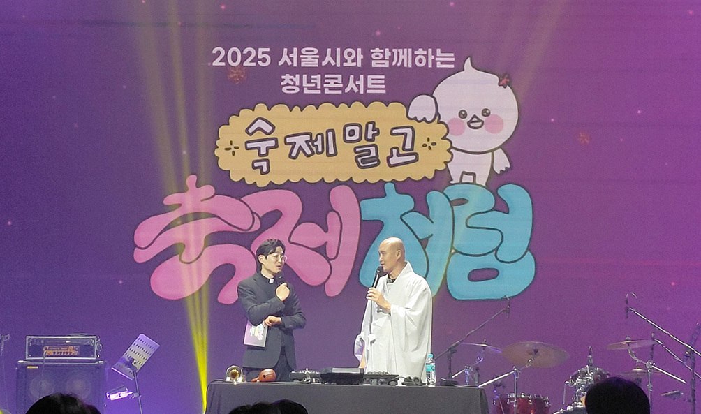 숙제말고 축제처럼 청년콘서트에서 MC 이창민 신부와 출연자 뉴진스님(개그맨 윤성호)이 청년들에게 주는 희망에 대해 이야기하고 있다.