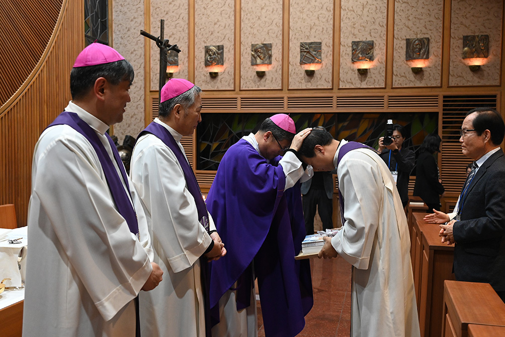 시노드 이행 단계를 시작하는 파견미사에서 각 교구 시노드팀 담당자들이 정순택 대주교에게 안수를 받고 있다.