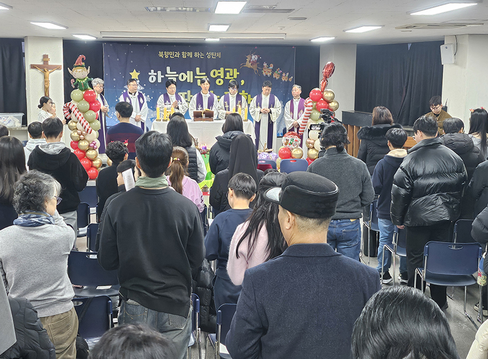 서울대교구 민족화해위원회가 2025년 12월 20일 서울 명동 가톨릭회관에서 마련한 ‘실향민과 함께 하는 성탄제’에 참석한 이들이 미사를 봉헌하고 있다.