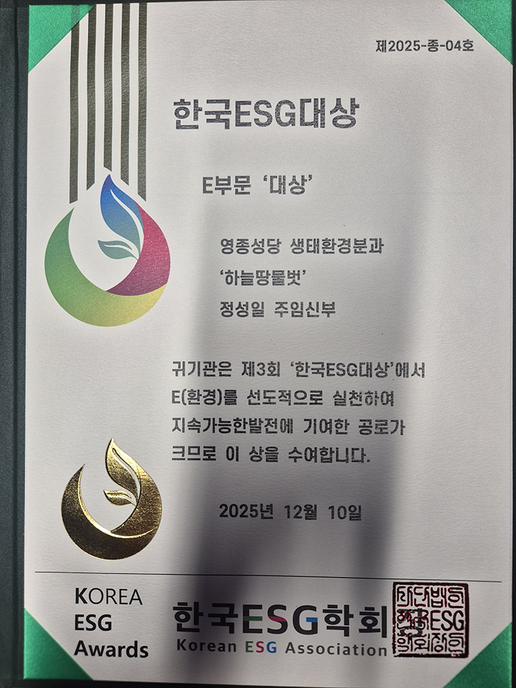 한국ESG대상은 사단법인 한국ESG학회가 ‘E(환경)·S(사회)·G(거버넌스, 투명경영)’ 분야에서 전문성과 실천력이 뛰어나고, 사회 발전에 크게 이바지한 기관에 수여하는 상이다. 영종본당은 이날 서울 영등포구 국회도서관 대강당에서 열린 시상식에서 종교기관으로 E(환경) 부문 최고상인 대상을 받았다.
