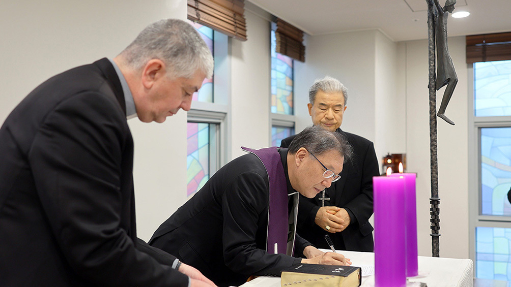 곽진상(가운데) 보좌 주교임명자가 조반니 가스파리(왼쪽) 대주교와 이용훈 주교가 지켜보는 가운데 서약서에 서명하고 있다. 수원교구 제공