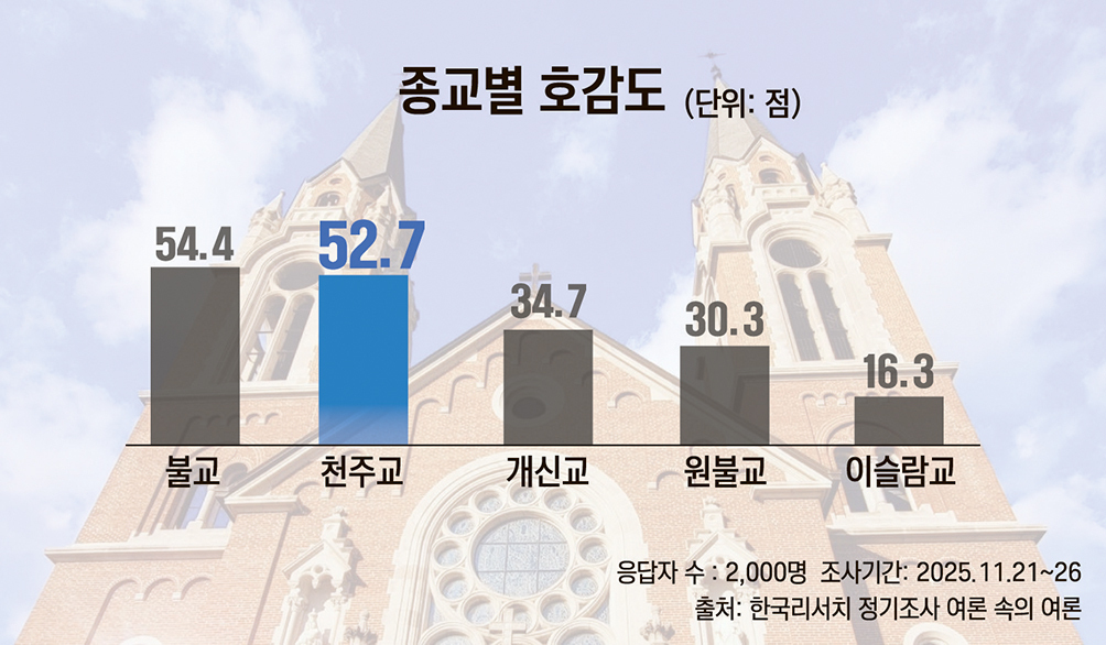 여론조사 전문기관 한국리서치의 ‘여론 속의 여론’ 팀이 지난해 12월 16일 발표한 2025년 종교인식조사에서 천주교가 전체 종교 중 호감도 순위 2위를 차지했다. 1위는 불교(54.4점)로 전년 대비 3.1점 상승했다. 개신교는 34.7점, 원불교 30.3점, 이슬람교 16.3점 등이었다.