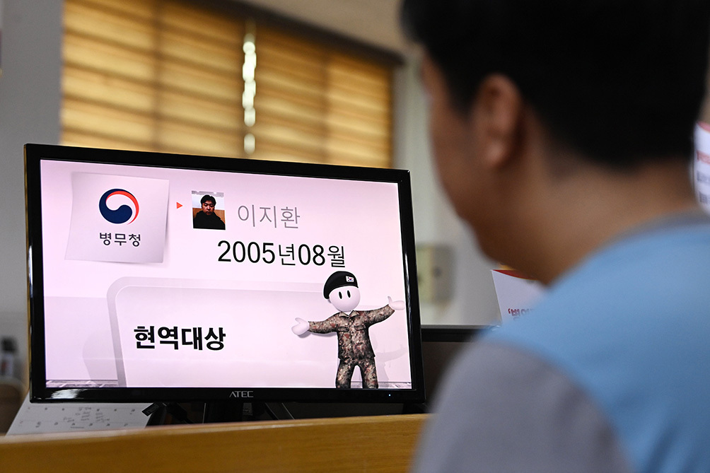 서울 영등포구 서울지방병무청 제1병역판정검사장에서 한 입영대상자가 현역대상 판정을 받고 있다. 뉴시스