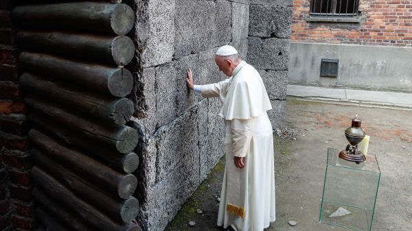 프란치스코 교황이 2016년 7월 29일, 폴란드 오시비엥침에 있는 아우슈비츠 나치 강제 수용소에 있는 죽음의 벽에 손을 대고 기도하고 있다. 2025년 4월 21일 향년 88세로 선종한 프란치스코 교황은 수백만 명의 유대인과 다른 종교인들에 대한 끔찍한 학살을 기억하고 규탄하는 것이 중요하다고 강조했다. OSV