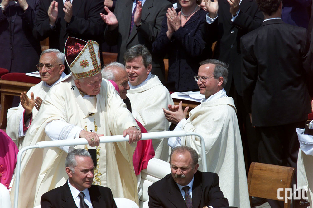 2000년 4월 30일 바티칸 성 베드로 광장에서 성 요한 바오로 2세 교황과 함께 교황의 전용차에 탑승한 안젤로 구젤(왼쪽 아래)씨. OSV