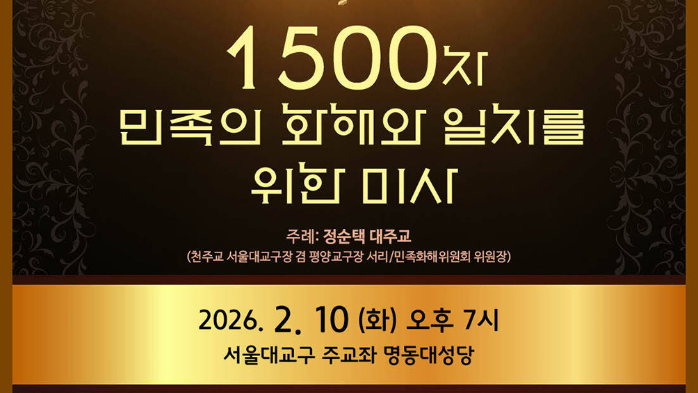 서울대교구 민족화해위원회는 10일 오후 7시 주교좌 명동대성당에서 서울대교구장 겸 평양교구장 서리 정순택 대주교 주례로 제1500차 ‘민족의 화해와 일치를 위한 미사’를 봉헌한다. 코로나19 시기를 제외하고는 매주 화요일 같은 장소, 같은 시간에 민족의 화해와 일치라는 지향을 두고 30년 넘게 미사가 이어져 온 것을 기념한다.