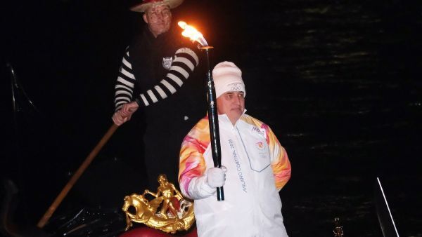 2026년 1월 22일, 이탈리아 베네치아에서 열린 밀라노-코르티나 동계 올림픽(2월 6일~22일 개최) 성화 봉송 행사에서 한 성화 봉송 주자가 곤돌라를 타고 베네치아 운하를 지나가고 있다. OSV