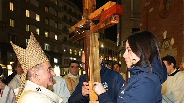 2026년 1월 29일, 밀라노의 산 바빌라 성당 앞에서 바티칸 체육 협회인 아틀레티카 바티카나 회원들이 마리오 델피니 밀라노 대주교에게 "선수들의 십자가"를 전달하고 있다. 이 십자가는 밀라노와 코르티나 담페초에서 열릴 2026 동계 올림픽 및 패럴림픽을 앞두고 밀라노 대교구에 전달됐다. OSV
