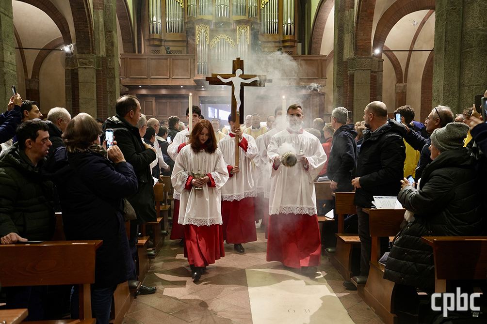 밀라노대교구 사제단과 평신도들이 1월 29일 밀라노 산 바빌라 대성당에서 미사를 거행하기 위해 '올림픽 십자가'를 앞세우고 입당하고 있다. OSV
