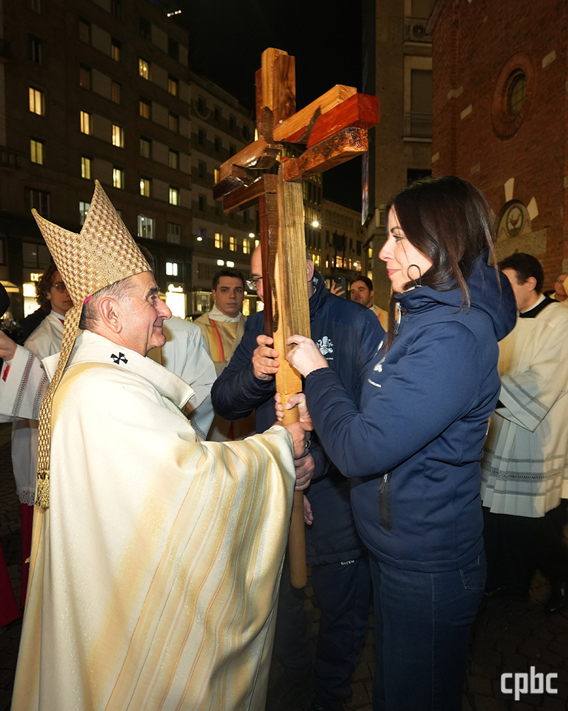 밀라노대교구장 마리오 델피니 대주교가 1월 29일 밀라노 산 바빌라 대성당 앞에서 바티칸 체육협회 회원으로부터 올림픽 십자가를 전달받고 있다. ‘선수들의 십자가’로 불리는 올림픽 십자가는 영국 미술가 존 콘월이 2012년 런던 올림픽을 위해 특별히 제작한 것으로 올림픽 개최지에 마련된 ‘선수들의 경당’에 안치돼 신자 선수들이 기도를 바칠 수 있도록 했다.OSV