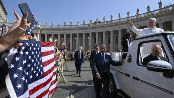 레오 14세 교황이 2025년 6월 18일, 바티칸 성 베드로 광장에 교황 전용차로 도착해 일반 알현을 위해 이동하면서 미국 국기를 들고 있는 순례자들에게 손을 흔들고 있다. 교황청(바티칸) 공보실은 2026년 2월 8일, 레오 14세 교황이 올해 미국을 방문할 계획이 없다고 확인했다. OSV