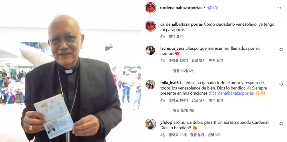 미국 교계 매체 EWTN에 따르면, 베네수엘라 전 카라카스대교구장 발타사르 포라스 추기경이 1월 30일 압수당했던 여권을 돌려받았다. 포라스 추기경은 여권 반환 당일 SNS에 “베네수엘라 시민으로서 여권을 갖고 있다”고 게시했다. 베네수엘라 주교회의는 “여권 반환은 단순한 행정 절차가 아니라 부당한 박해의 끝을 알리는 신호”라고 환영했다.