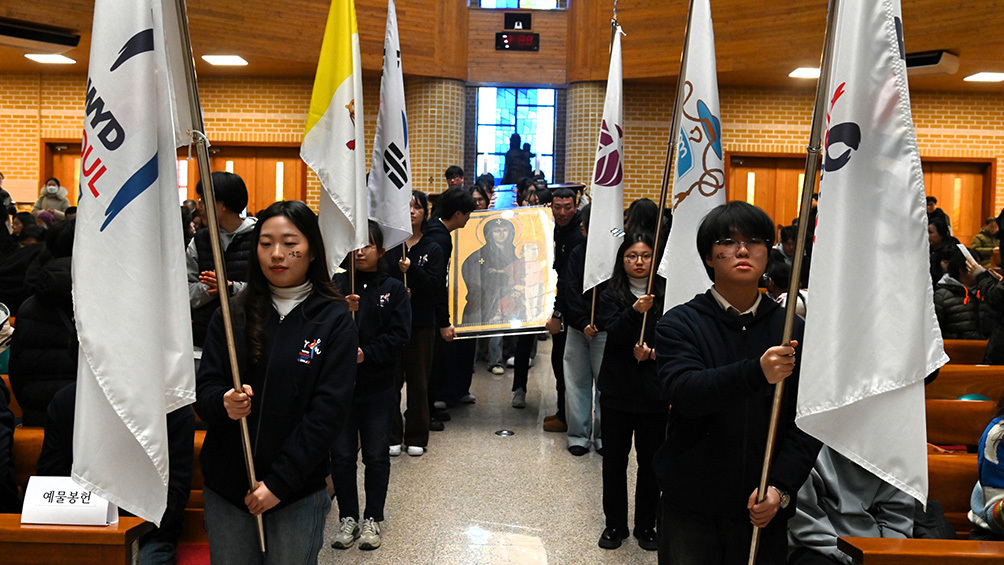 원주교구 청년들이 7일 원주교구 배론성지 최양업 신부 기념 대성당에서 열린 원주교구대회 발대미사에서 WYD 십자가와 성모성화를 든 채 입당하고 있다.
